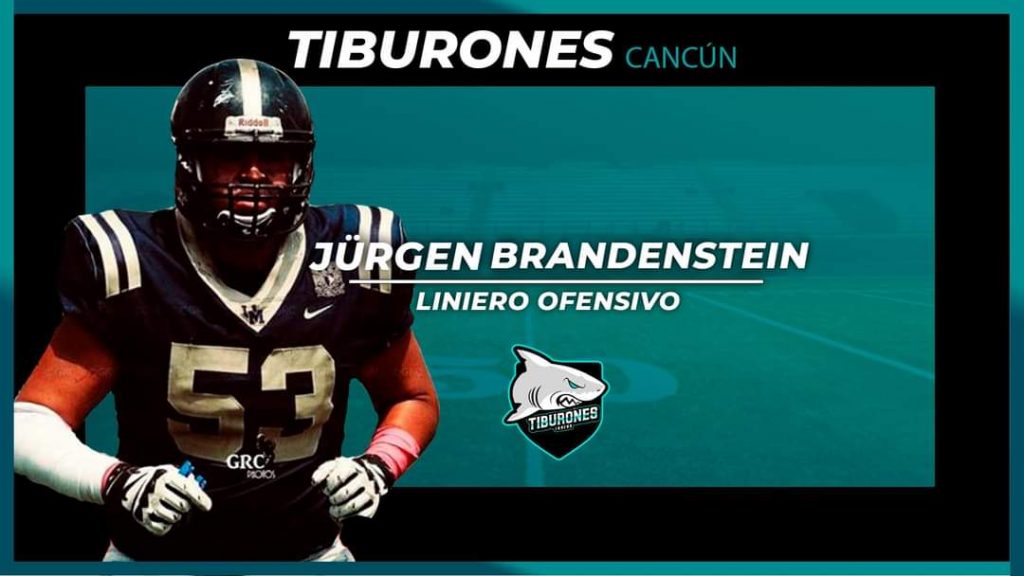 Cancún, Q. Roo, Viernes 06 de Noviembre del 2020, poderycrítica.- El «gigante» Jürgen Brandenstein es el nuevo refuerzo de los Tiburones de Cancún que en 2021 debutarán en la Liga Profesional de Fútbol Americano de México (FAM).