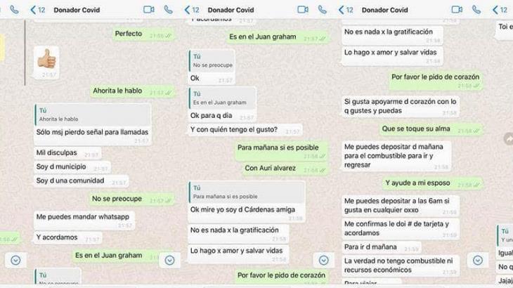 Al llegar el momento de ponerse de acuerdo para el día en que se debía presentar a realizar la donación, la persona le pidió un depósito de 300 pesos para ponerle gasolina a su coche para poderse desplazar a Villahermosa, debido a que dijo vivir en un poblado de Cárdenas.