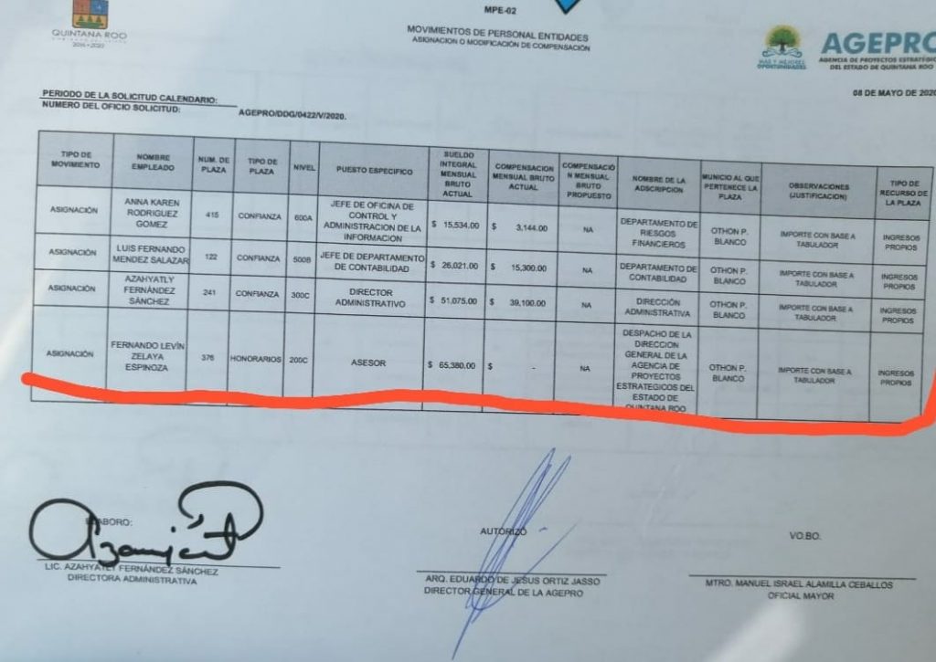 Como es el caso del ex servidor público y figura política, Fernando Zelaya Espinoza quien, de acuerdo con la asignación o modificación de compensación del personal de la Agepro, está adscrito al despacho de la dirección general de la dependencia en el municipio de Othón P. Blanco y ostenta el número de plaza 375 de honorarios con el nivel 200C, con el supuesto cargo de asesor, con un sueldo integral mensual bruto actual de 65 mil 380 pesos