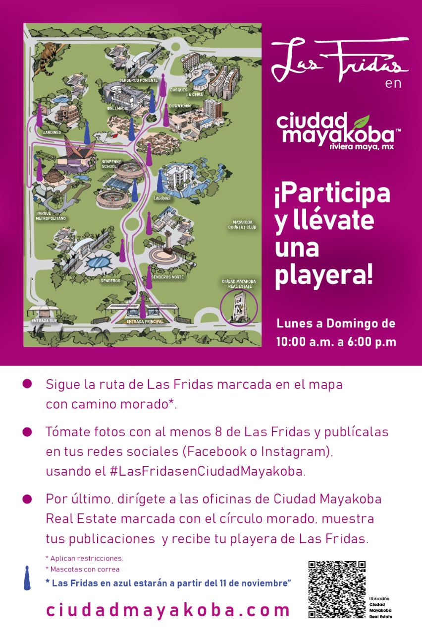 Las esculturas estarán exhibidas a largo de las avenidas principales de Ciudad Mayakoba, en un circuito que permitirá su apreciación, desde un automóvil, bicicleta o caminando, todos los visitantes recibirán un mapa donde se aprecia la ubicación exacta de cada una de Las Fridas.