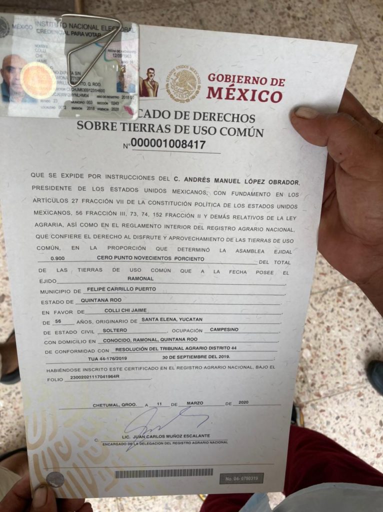 Jaime Collí, agregó que a pesar de que el documento agrario ya está a su nombre, el presidente del comisariado ejidal, Ezequiel López Palomo, no lo acepta como legítimo ejidatario del núcleo agrario.