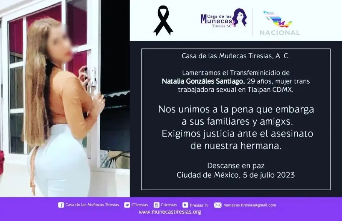 “El día de ayer, miércoles 5 de julio de 2023, Natalia González Santiago, mujer trans de 29 años y trabajadora sexual, fue víctima de un violento asesinato en el hotel Condesa, ubicado en Tlalpan, Ciudad de México”, señaló la organización Casa de las Muñecas Tiresias.