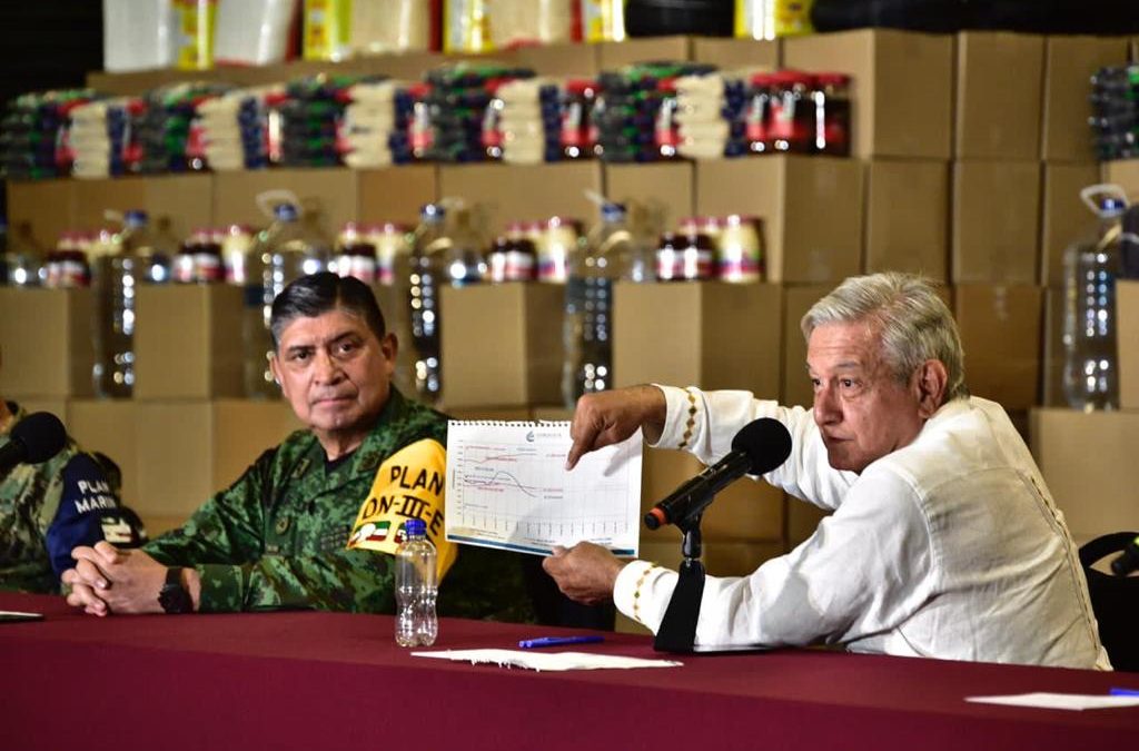 “Se han acopiado más de mil toneladas de alimentos y de otro tipo de mercancías en apoyo a los damnificados. No sólo se está aplicando el Plan Marina, el Plan DN-III; se está recibiendo también apoyo de gobiernos internacionales, lo cual agradecemos mucho, al gobierno de Alemania, al gobierno de Rusia, a empresas mexicanas.”
