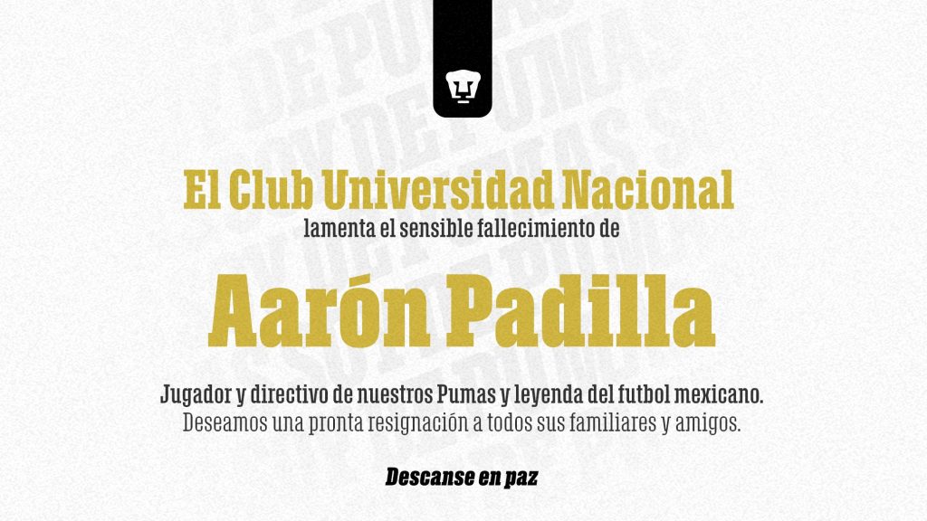 Ciudad de México, junio 14.- A los 77 años de edad, murió este día Aarón Padilla, un referente dentro del futbol mexicano, en especial en los Pumas de la UNAM.