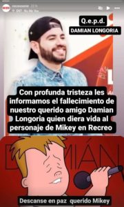 Con profunda tristeza les informamos el fallecimiento de nuestro querido amigo Damián Longoria, quien diera vida al personaje de Mikey en Recreo. Descanse en paz querido Mikey»