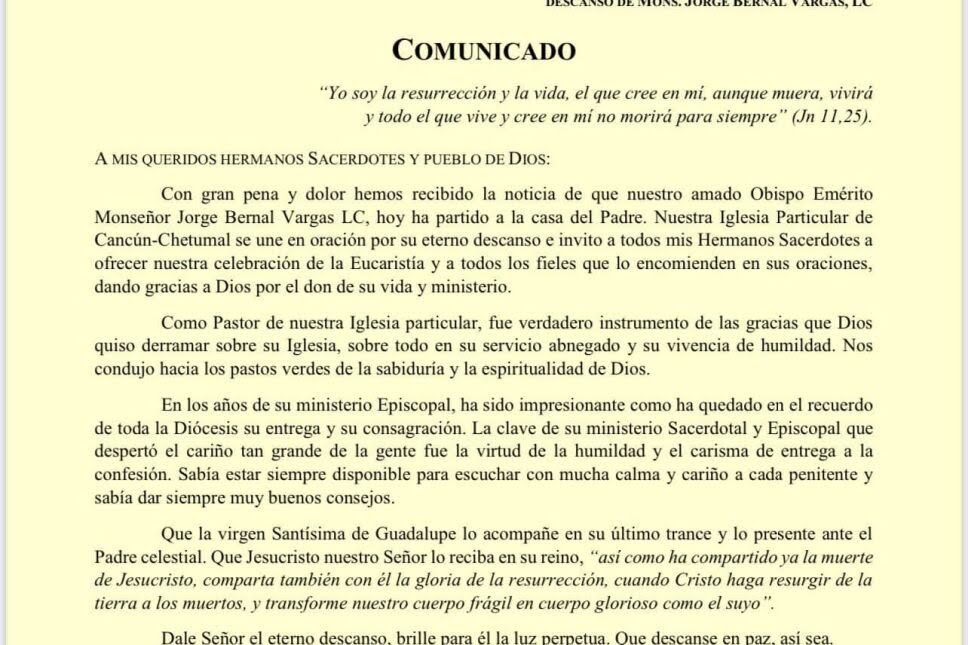 PODER Y CRÍTICA | REDACCIÓN | Muere el obispo Jorge Bernal Vargas a sus 95 años de edad, perteneciente a la Diócesis de Cancún-Chetumal, así fue confirmado este martes 11 de julio de 2023.