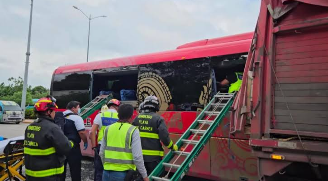 El hecho ocurrió alrededor de las 15:00 horas, cuando un autobús de la empresa Del Valle, que transportaba trabajadores del hotel Dorado Maroma, atropelló a una mujer que intentaba cruzar la vía. Tras el impacto, el conductor perdió el control de la unidad y colisionó violentamente contra la parte trasera de un tráiler estacionado en el lugar.