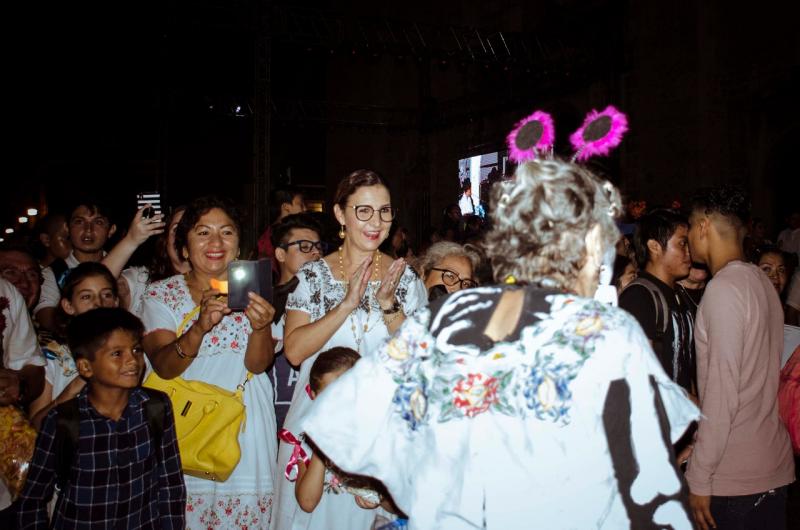 La aparición de «Lela Oxkutzcaba», creación de Wilberth Herrera, fue uno de los momentos especiales de la noche. Ella, el títere «Chichí Lochi», Ángel Aguilar en el papel de la «comadre Chona» y Miguel Coello «Ruperta» hablaron de los elementos que se usan en Yucatán para un altar dedicado a los muertos.