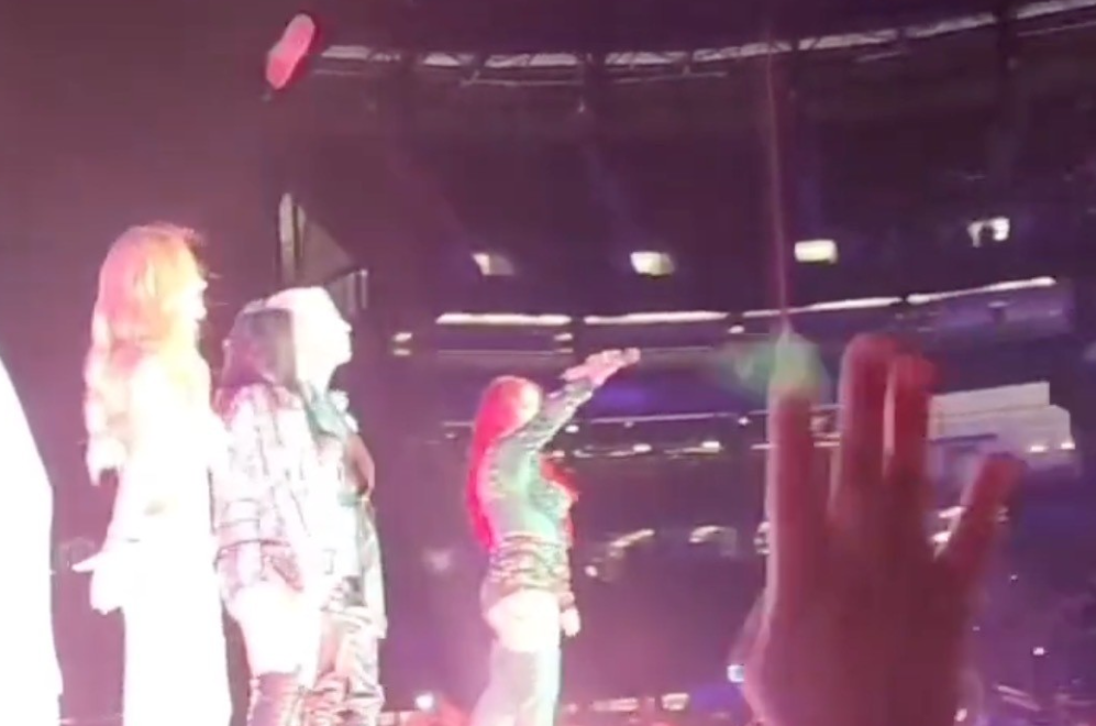 En un video que circula en redes sociales, se observa el momento en el que una persona del público avienta al escenario lo que parece ser una pulsera que cae en la cara de Anahí y sin querer la golpea en el ojo.