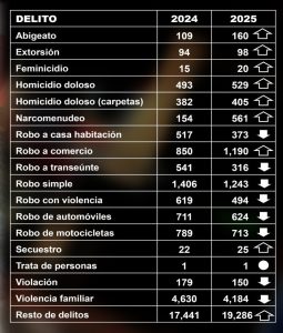 De acuerdo con carpetas de investigación, los homicidios dolosos pasaron de 493 a 529 casos, mientras que los feminicidios aumentaron de 15 a 20. La extorsión también creció ligeramente (de 94 a 98), y el delito de abigeato subió de 109 a 160 casos.