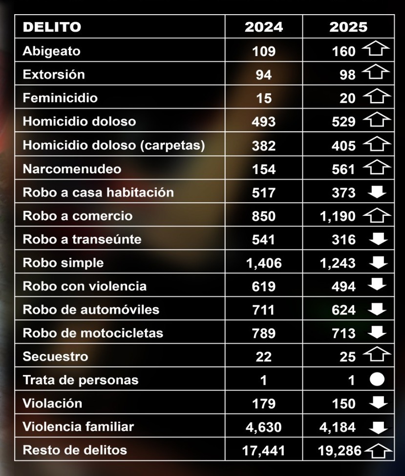 El repunte más alarmante se observa en el narcomenudeo, que se disparó de 154 a 561 carpetas en tan solo un año, un incremento de más del 260%. Asimismo, el robo a comercio creció de 850 a 1,190 denuncias, lo que refleja una afectación directa a la economía local y al sector empresarial.