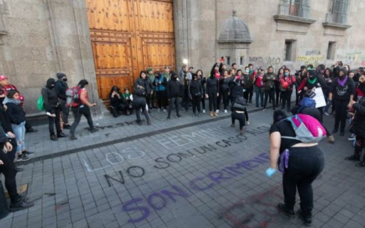 México, 18 febrero; poderycritica.-Feministas protestan afuera de Palacio Nacional por el feminicidio de la niña de siete años, Fátima, y tras los dichos de ayer lunes del Presidente Andrés Manuel López Obrador, quien les pidió no pintar las puertas de ese inmueble.