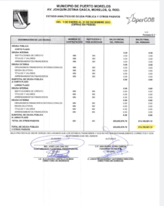 La documentación oficial firmada de puño y letra por funcionarios que se enlistan en el saqueo lacerante que ha hundido al municipio, exhibe que tan sólo en un año del período de gobierno de Blanca Merari, con respecto al de su antecesora Laura Fernández Piña, se ejerció un gasto desmedido del dinero del pueblo generando una deuda pública cuyo monto asciende a cinco millones de pesos 95 mil 974 pesos 81 centavos. Los ejercicios detallados en el Estado analítico de la deuda y otros pasivos corresponden al período 1 de enero al 31 de diciembre de 2021 y del 1 de enero al 31 de diciembre de 2023.