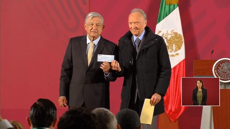 En Palacio Nacional, el fiscal Alejandro Gertz Manero, hizo entrega de un cheque al titular del Instituto, Ricardo Rodríguez Vargas, como parte de las acciones de la FGR en la recuperación de bienes y recursos económicos de la delincuencia.