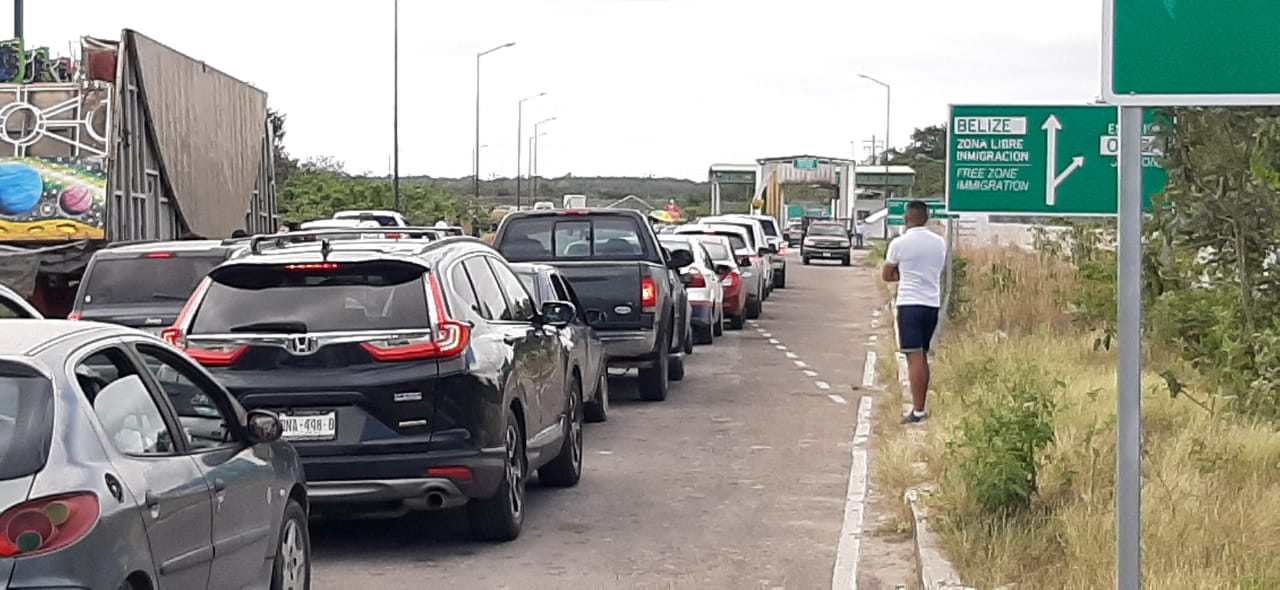 Chetumal, Q. Roo, lunes 01 de febrero de 2021, poderycrítica.- Desde muy temprana hora, una larga fila de vehículos se registró en la aduana nueva de Belice, con motivo de la reapertura de la zona libre del vecino país. Aprovechando el puente laboral, chetumaleños y visitantes de otros destinos esperan acceder a los descuentos y ofertas anunciadas desde días atrás por empresarios y autoridades del paraíso fiscal. La espera es de por lo menos dos horas para ingresar al paraíso fiscal y pagar un costo de 230 pesos por sanitización de la unidad motor.