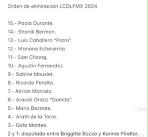 En el último lugar se encuentra Paola Dorantes, seguida de Shanik Berman y «Potro», que cabe destacar, coinciden con las expulsiones de estas tres semanas.
