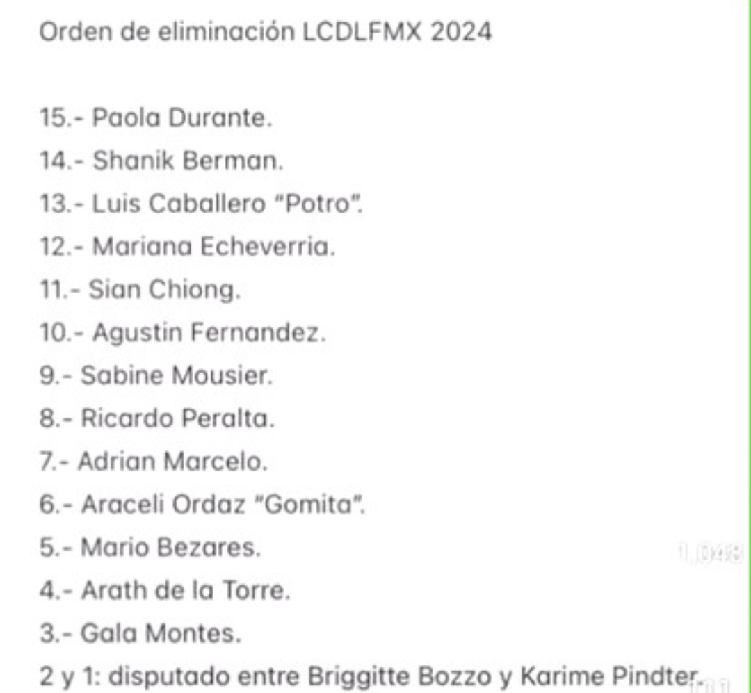 Lo que ha causado sorpresa es que, de acuerdo con el listado, la próxima eliminada será Mariana Echeverría; mientras que en el lugar del quinto eliminado está el nombre de Sian Chiong.
