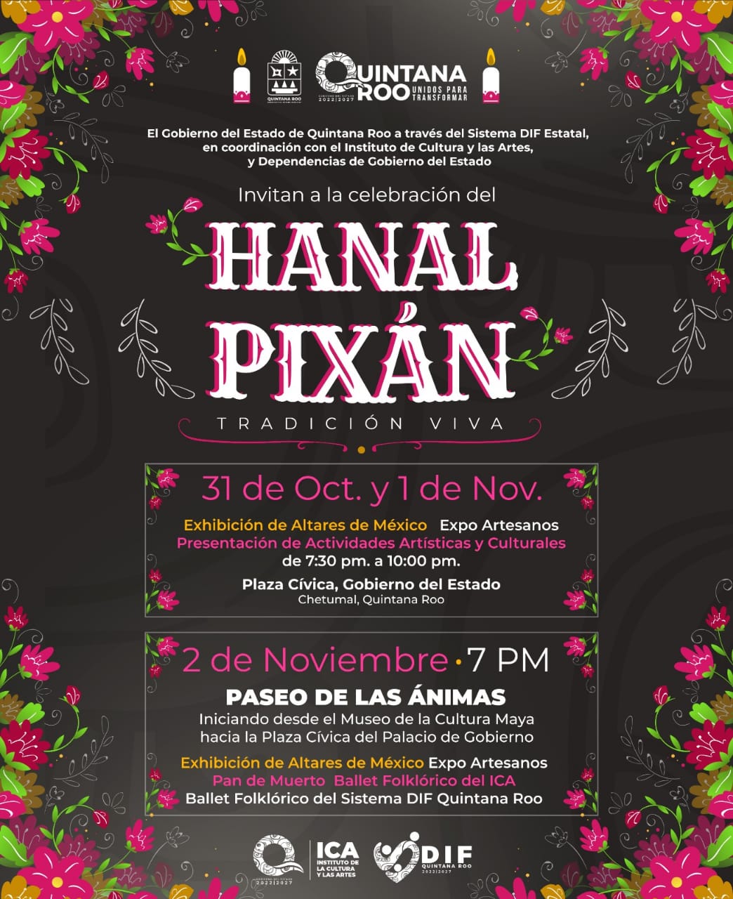 Por lo que el Gobierno del Estado y el DIF estatal invitan a las familias y población en general a la celebración del “Hanal Pixán” los días 31 de octubre, 1 y 2 de noviembre de 19:30 horas a 22:00 horas en la Plaza cívica del Palacio de Gobierno.