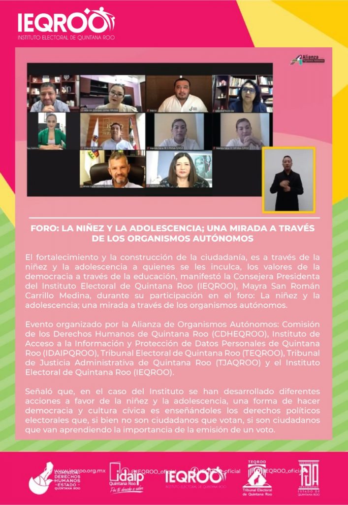 Chetumal, Q. Roo, Martes 21 de Septiembre de 2021, poderycrítica.- El fortalecimiento y la construcción de la ciudadanía, es a través de la niñez y la adolescencia a quienes se les inculca, los valores de la democracia a través de la educación, manifestó la Consejera Presidenta del Instituto Electoral de Quintana Roo (IEQROO), Mayra San Román Carrillo Medina, durante su participación en el foro: La niñez y la adolescencia; una mirada a través de los organismos autónomos.