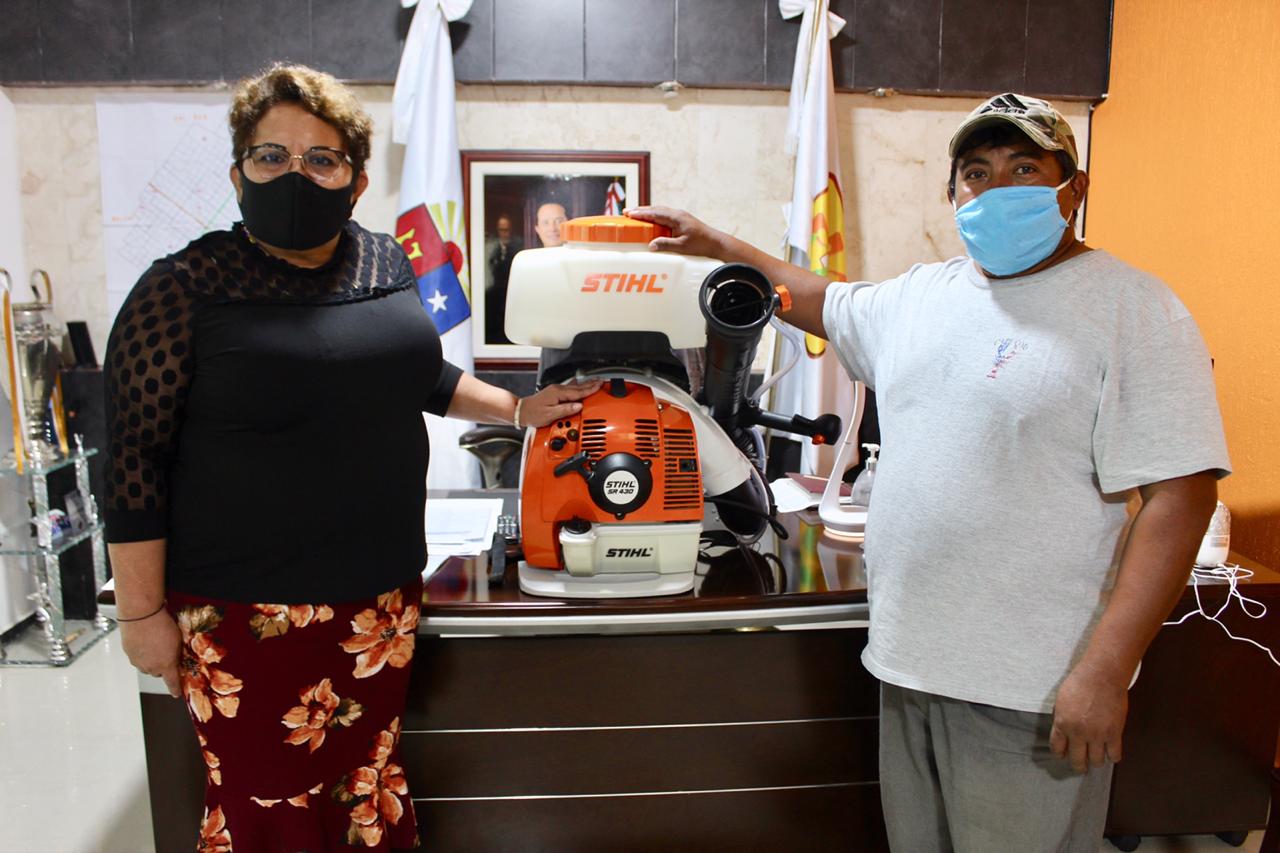 En este sentido, la alcaldesa entregó al director de Protección Civil, Miguel Nájera una motoaspersora (motor stihl 2-mix con barrido de gases por aire) que servirá para sanitizar diariamente las áreas públicas de la ciudad. #QuédateEnCasa #JuntosSaldremosAdelante