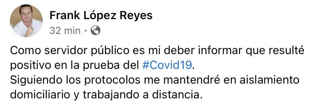 Cancún, Q. Roo, Viernes 30 de Octubre de 2020, poderycrítica.- El secretario de Turismo Municipal en Benito Juárez, Frank López Reyes, informó que dio positivo a Covid-19.