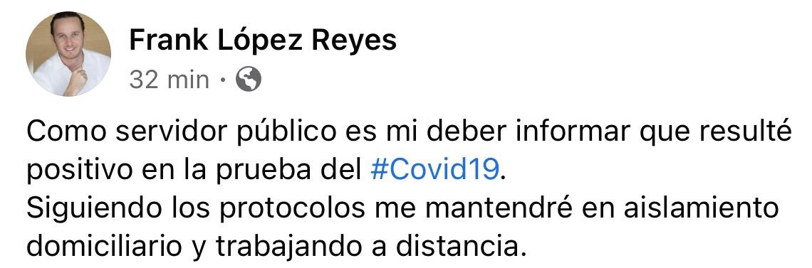Cancún, Q. Roo, Viernes 30 de Octubre de 2020, poderycrítica.- El secretario de Turismo Municipal en Benito Juárez, Frank López Reyes, informó que dio positivo a Covid-19.