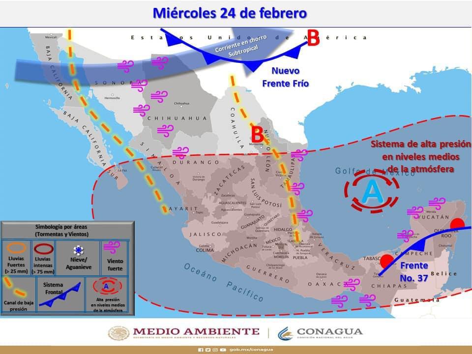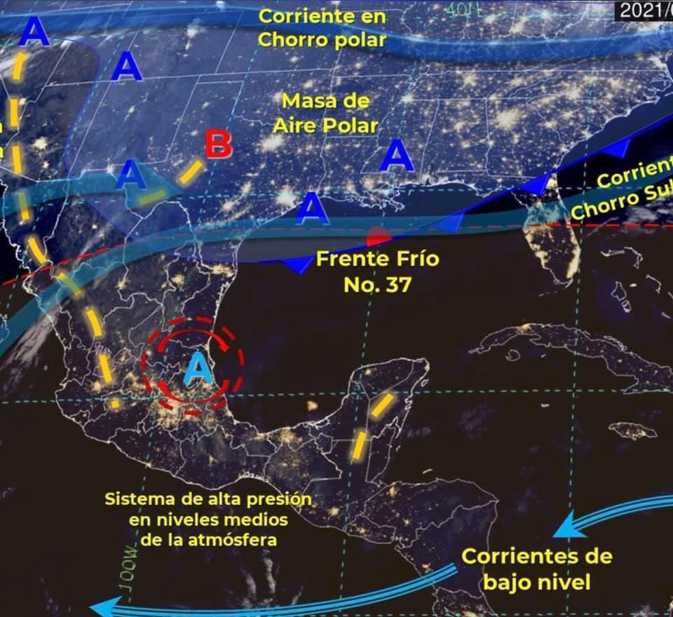 Con base en el Servicio Meteorológico Nacional, el titular de la COEPROC Adrián Martínez Ortega informó que el frente frío número 37 y la masa de aire polar influenciará en el oriente y sureste del territorio nacional, ocasionando lluvias fuertes a puntuales intensas y ráfagas de viento en dichas regiones, incluida la Península de Yucatán.