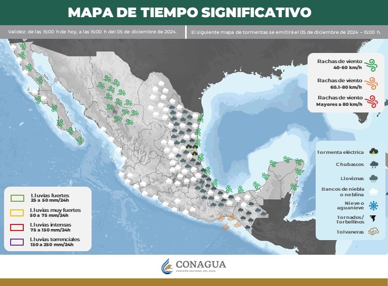 Esto originará vientos fuertes de 30 a 50 km/h con rachas de 60 a 80 km/h y chubascos en varias regiones, con lluvias puntuales fuertes en Tamaulipas.