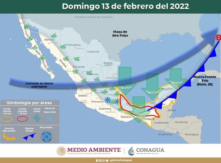 “Este día, el sistema frente frío 29 recorrerá rápidamente los estados del norte, noreste, oriente y sureste de México, dicho sistema se aproximará a la Península de Yucatán, donde se pronostica lluvias fuertes con tormentas eléctricas en la región, por lo que se pide a la ciudadanía tomar sus precauciones”, dijo Martínez Ortega.