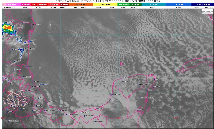Dijo que el reporte de temperaturas mínimas de las estaciones automáticas y convencionales de las 09:00 horas del 01/02/2021 a las 09:00 horas del 02/02/2021, indicó que en Felipe Carrillo Puerto 12.5 grados y en Nicolás Bravo 12.6.