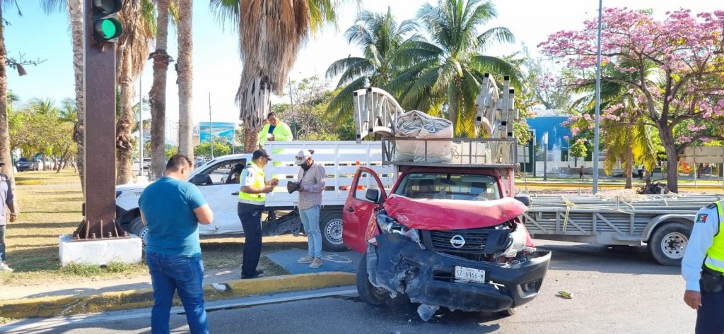 Al parecer, una camioneta tipo estaquita quiso ingresar al bulevar Kukulcán desde esta glorieta, en el cruce con la avenida Bonampak, al rebasar otra camioneta con remolque, lo que hizo que colisionaran de frente.