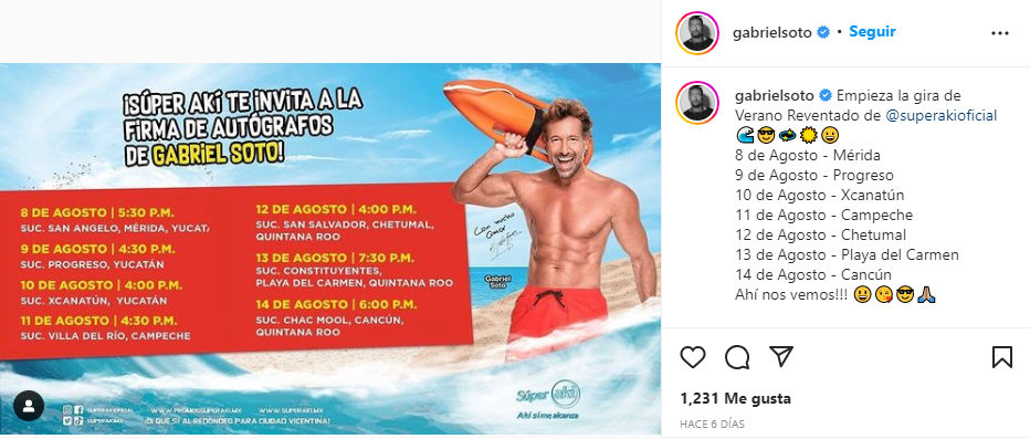 Poder y Crítica | Redacción | El actor Gabriel Soto anunció su firma de autógrafos en varios Súper Aki de México, contando el Súper aki de la sucursal de la Chac Mool en Cancún, por medio de todas sus redes sociales.