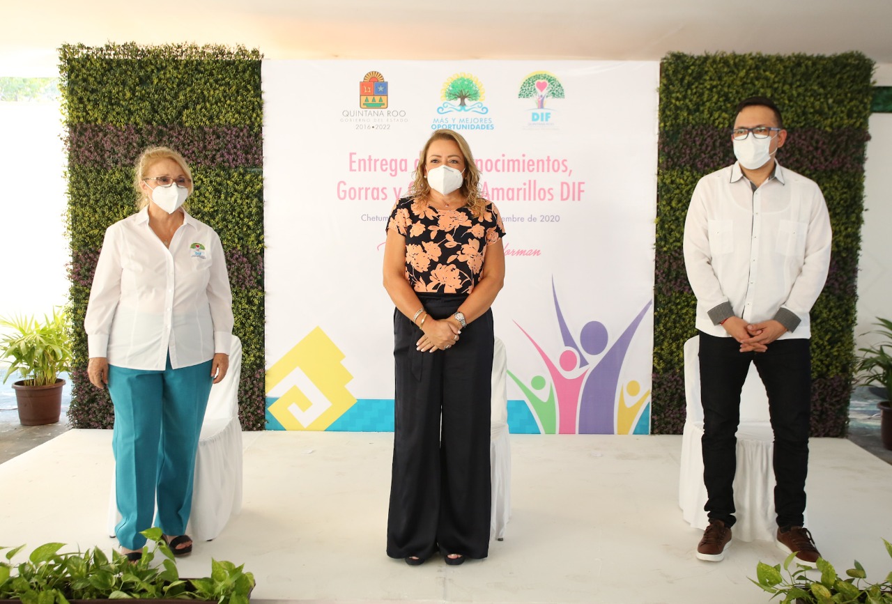 Chetumal, Q. Roo, Martes 22 de septiembre del 2020, poderycrítica.- La presidenta del Sistema Estatal DIF Quintana Roo, Gaby Rejón de Joaquín entregó reconocimientos a 134 trabajadores del organismo que se sumaron a la estrategia de gorras y chalecos amarillos del Gobierno del Estado, apoyando durante la pandemia del Covid-19 en el armado de dotaciones alimentarias y en la entrega casa por casa en los once municipios, a quienes dijo que sus acciones contribuyeron de manera importante a mejorar la calidad de vida de miles de familias quintanarroenses.
