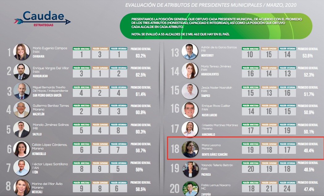 Cancún, QR a 9 de marzo de 2020.- La Presidente Municipal Mara Lezama fue ubicada en la posición 18 de los 55 mejores alcaldes y alcaldesas del país, de acuerdo a la última encuesta publicada por el portal CAUDE Estrategias, en la que se calificaron los atributos de honestidad, capacidad e integridad.