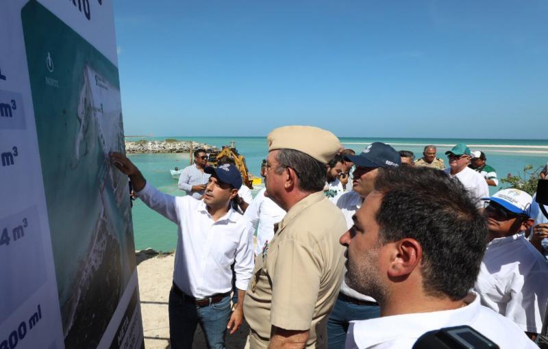 El Gobernador constató las primeras labores de este proyecto que contempla la instalación de la infraestructura para el movimiento de la arena, para lo que se estarán aplicando recursos por casi 8 millones de pesos en la obra física de los puertos de abrigo de Chuburná y Telchac, que consiste en la excavación y colocación de tubería de fija y flotante de 10 pulgadas para su traslado.