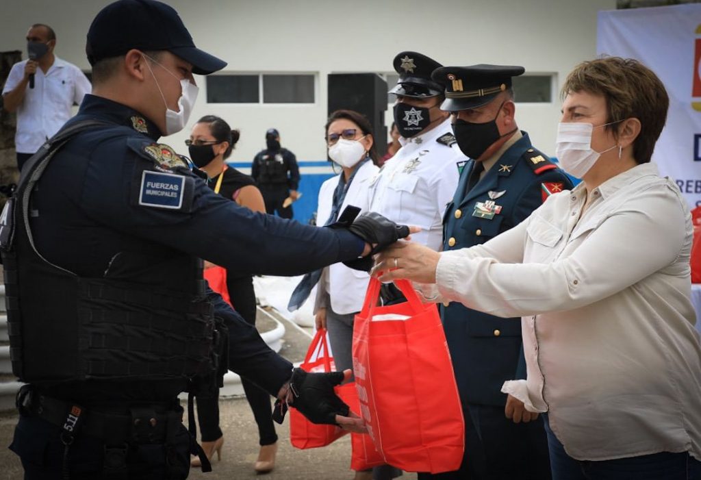 Junto a la alcaldesa en la recepción de estos materiales estuvieron el Capitán Segundo de Infantería, Víctor Manuel Reyes Ramírez, elementos policiacos y el encargado del despacho de la Secretaría de Seguridad Pública y Tránsito Municipal, Jorge Robles Aguilar, quien expresó la entrega de este material de alta valía para la corporación, especialmente por la situación epidemiológica que se vive actualmente, y refrendó su compromiso de seguir velando por la seguridad del municipio.