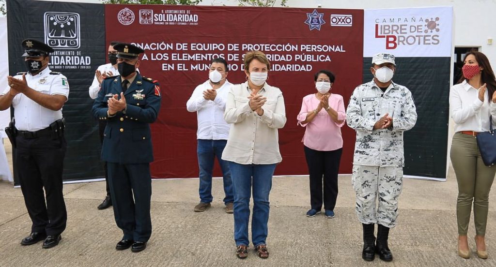 Playa del Carmen, Q. Roo, martes 24 de Noviembre de 2020, poderycrítica.- Como parte de la estrecha colaboración entre la iniciativa privada y la administración municipal para hacerle frente al Covid-19, la presidenta Laura Beristain Navarrete recibió, en las instalaciones de Seguridad Pública y Tránsito Municipal, la donación de 11 mil cubrebocas por parte de la cadena comercial Oxxo, a manera de agradecimiento y con la intención de contribuir en el cuidado y protección de los elementos policiacos en esta circunstancia epidemiológica.
