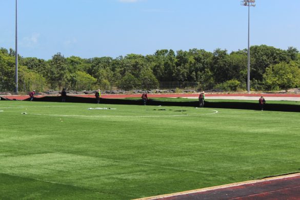 Sarabia May explicó que los trabajos consisten en colocación de 7 mil 381.30 metros cuadrados de pasto sintético en la cancha de fútbol, que incluye la ejecución de trabajos preliminares como el retiro existente del pasto en malas condiciones, el barrido de la superficie, riego de impregnación a base de emulsión catiónica, la colocación del pasto sintético y la limpieza del dren de la cancha de fútbol, entre otras acciones.