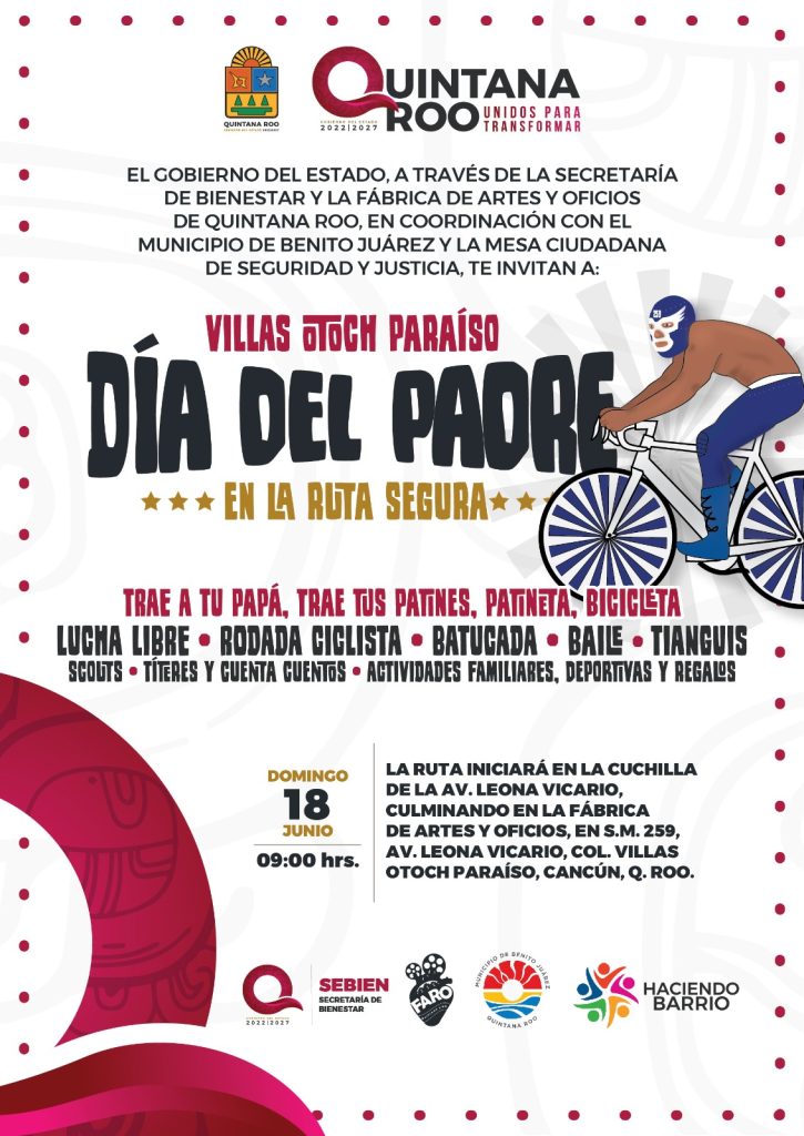 PODER Y CRÍTICA | REDACCIÓN | Para fomentar la sana convivencia y la unión familiar, encomienda de la gobernadora Mara Lezama Espinosa, la Secretaría de Bienestar (SEBIEN), invita a la comunidad cancunense a celebrar el Día del Padre en la Fábrica de Artes y Oficios (FARO), este domingo 18 de junio a partir de las 9 de la mañana.