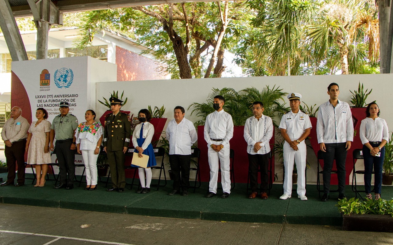 PODER Y CRÍTICA | REDACCIÓN | Con una ceremonia cívica realizada por la SEFIPLAN en la Escuela Secundaria General No 11 “Othón P. Blanco”, el Gobierno de Quintana Roo conmemoró en Chetumal el 77 Aniversario del Día de la Organización de las Naciones Unidas (ONU), que entró en vigor a partir del 24 de octubre de 1945. Con la representación de la gobernadora Mara Lezama Espinosa, presidió el acto, José Luis Martín Lavadores Montero, subsecretario de Educación Básica de la Secretaría de Educación de Quintana Roo, quien estuvo acompañado de autoridades civiles y militares y alumnos destacados de la institución.