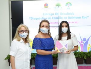Para finalizar, la señora Gaby Rejón de Joaquín y la directora general María Elba Carranza Aguirre entregaron a las presidentas y presidente de los DIF municipales los resultados del Diagnóstico de Familia en Quintana Roo.