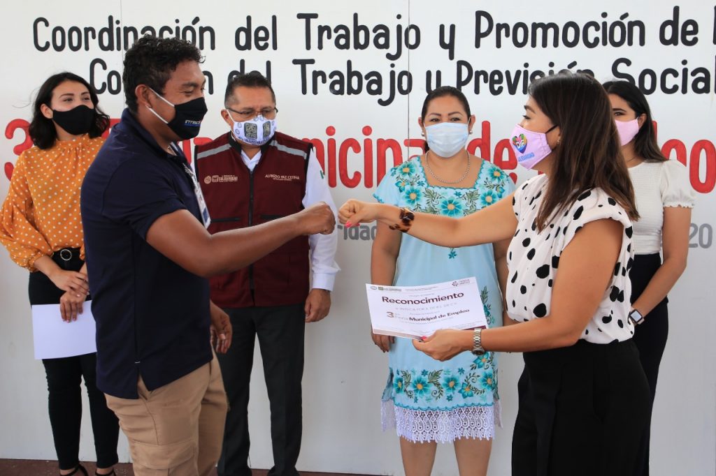 La Tercera Feria Municipal del Empleo tuvo lugar en el domo del fraccionamiento de Misión de las Flores, donde el secretario general del Ayuntamiento, Alfredo Paz Cetina, entregó reconocimientos a las empresas participantes, acompañado por la regidora Luz Elena Muñoz Carranza; la directora general del DIF municipal, Mireya Díaz Aguilar; la secretaria de Turismo local, Patricia Medina Zamora y la directora general del Instituto de las Mujeres, Mónica Bargas Caporali.