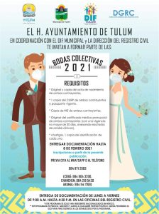 Tulum, Q. Roo, Martes 26 de Enero de 2021, poderycrítica.- El Ayuntamiento de Tulum, el Sistema para el Desarrollo Integral de la Familia y la Dirección General del Registro Civil, invitan a las parejas que deseen formalizar su matrimonio, a participar en el programa “Bodas Colectivas 2021”, celebración que se lleva a cabo cada 14 de febrero de manera gratuita.