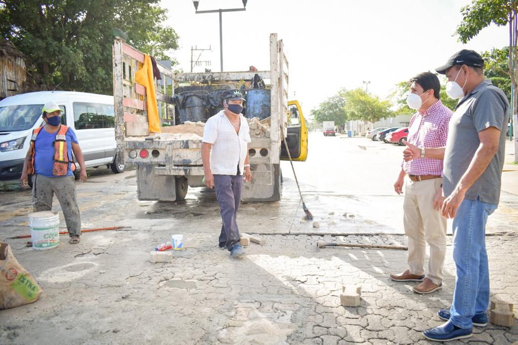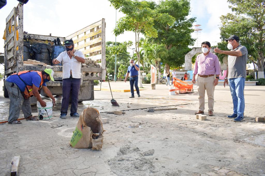 El arranque de los trabajos que lleva a cabo una cuadrilla de trabajadores fue supervisado por el presidente municipal, Víctor Mas Tah y el titular de la dirección de Servicios Públicos, Adrián Manzanilla Lagos, quien dijo que son más de 100 metros cuadrados donde la falta de mantenimiento de varios años y el tráfico vehicular afectó este recubrimiento, por lo que el personal de Servicios Públicos trabaja en sustituir las piezas afectadas.