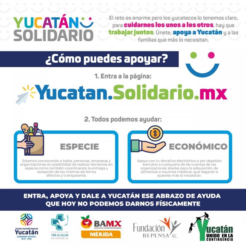 En respuesta al llamado del Gobernador Mauricio Vila Dosal para solidarizarse en este momento con los que más resienten esta situación, surgió este proyecto, que une esfuerzos entre autoridades y ciudadanía, el cual mediante la página electrónica www.yucatan.solidario.mx, concentra las acciones de apoyo de la sociedad civil organizada e iniciativa privada.