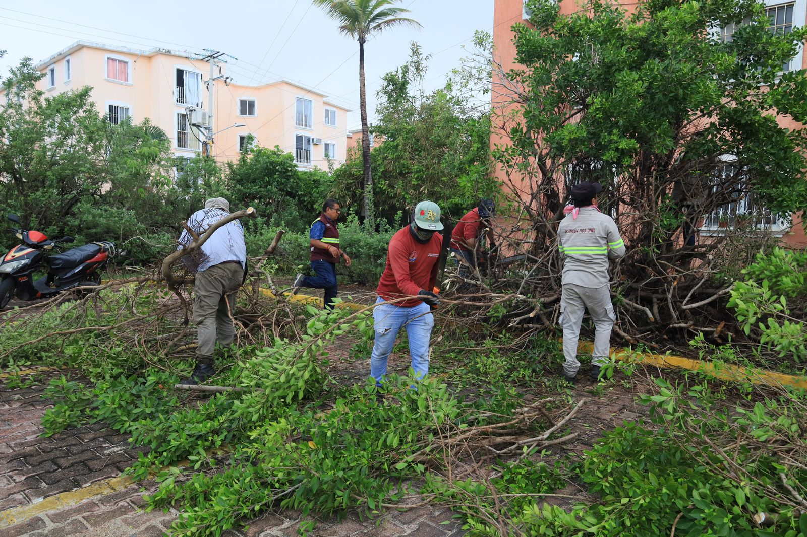 Al recorrer diversos puntos de la ciudad, junto con los directores de Servicios Públicos, Antonio de la Torre Chambe, y de Parques y Áreas Jardinadas, Sergio Torres Chávez, primeramente constató la labor y acciones preventivas que mantiene el personal de dicha dependencia en las calles de Cancún, como la poda de árboles caídos en diferentes puntos como la avenida Kohunlich casi con avenida La Luna.