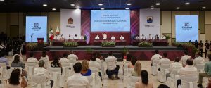 Mientras que, en el interior del Centro de Convenciones, se contó con un aforo limitado y con los asientos acomodados conforme a los lineamientos estipulados por las autoridades federales de salud, que recomiendan mantener la sana distancia, asimismo, se sanitizó de forma constante cada una de las áreas del local.