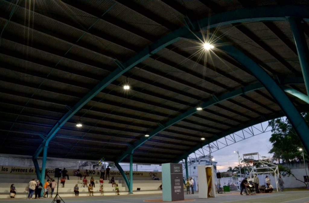 La Presidente Municipal, Mara Lezama, fue la encargada de levantar el interruptor eléctrico para brindar mayor seguridad en la zona, gracias a la instalación de 415 luminarias nuevas, en un evento realizado en el domo deportivo del Parque de las Personas con Discapacidad.
