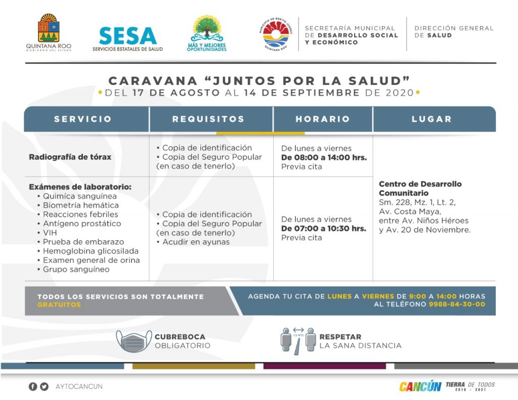 Los servicios se agendará por medio de citas al teléfono 998884-30-00 de la Dirección General de Salud Municipal; es importante resaltar que son de manera gratuita y se atenderán aproximadamente 90 personas por día.