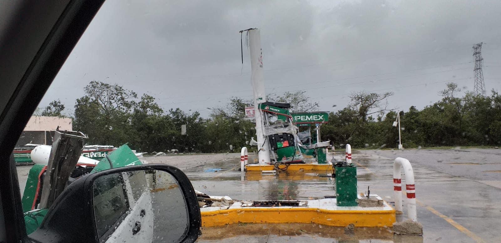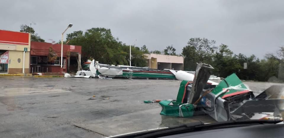 “En su entrada el huracán “Grace” está empezando a causar daños fuertes entre akumal y Tulum a la altura casi del hotel Catalunia en la Riviera Maya una estación de gasolina quedó asi”.